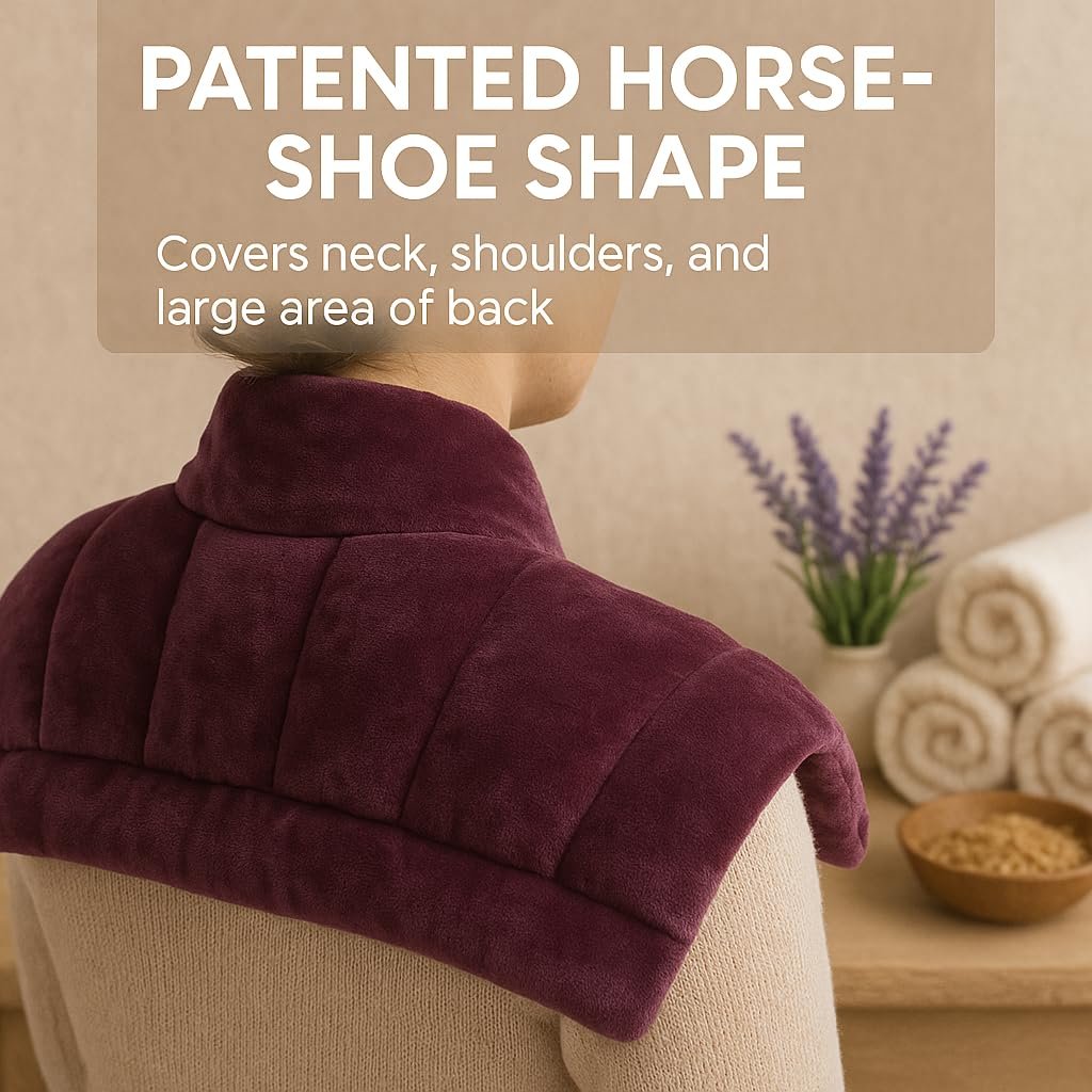 • DESIGN: The patented horse-shoe shape covers the neck, shoulder, and a large area of the back to comfort all joints and nerves that bear the stresses throughout the day