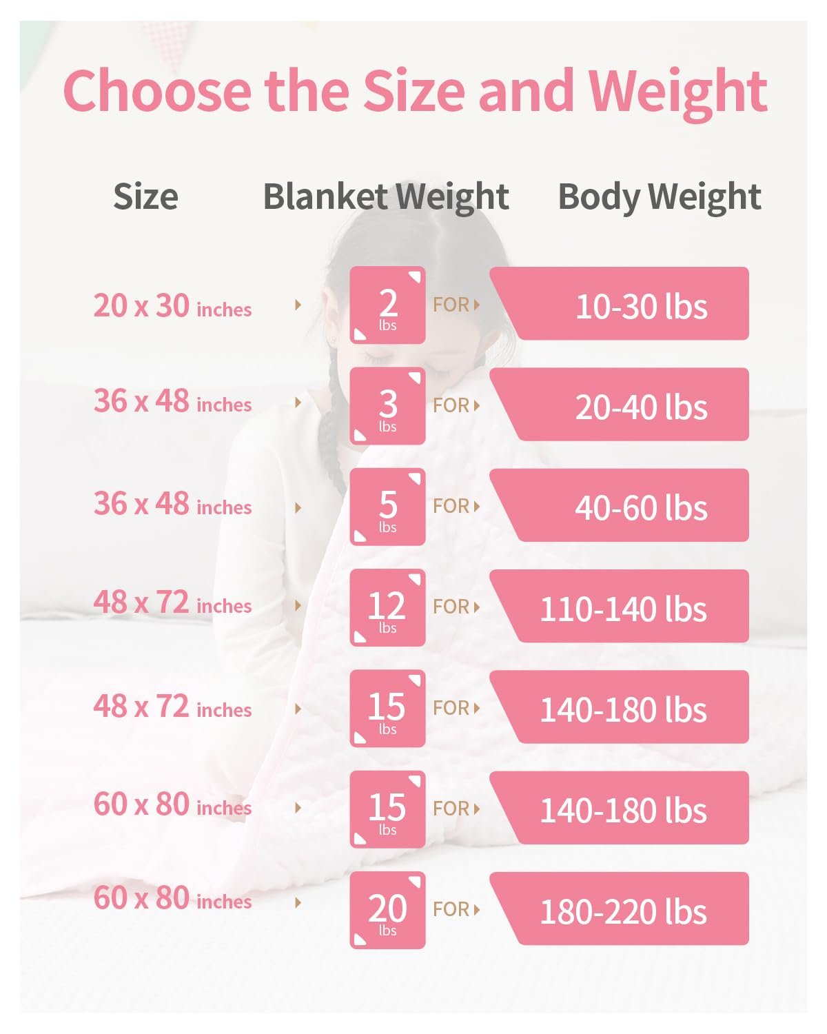 Choose the Right Weight: We recommend a blanket that is about 10% of your body weight. Our carefully selected blanket weights of 12 lbs, 15 lbs, and 20 lbs are suitable for different body weights of 100-140 lbs, 140-190 lbs and 190-240 lbs respectively.