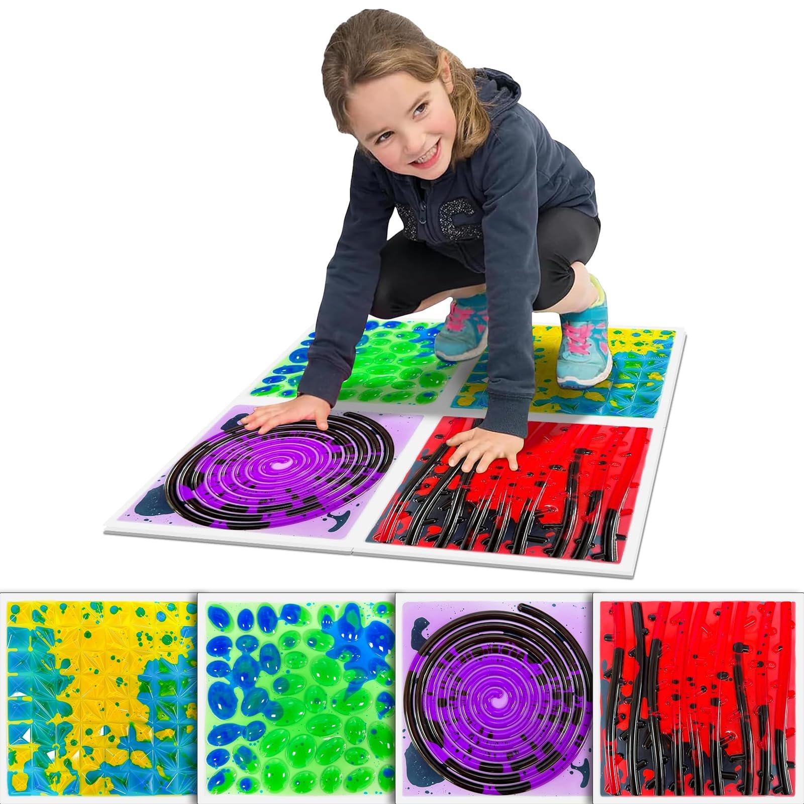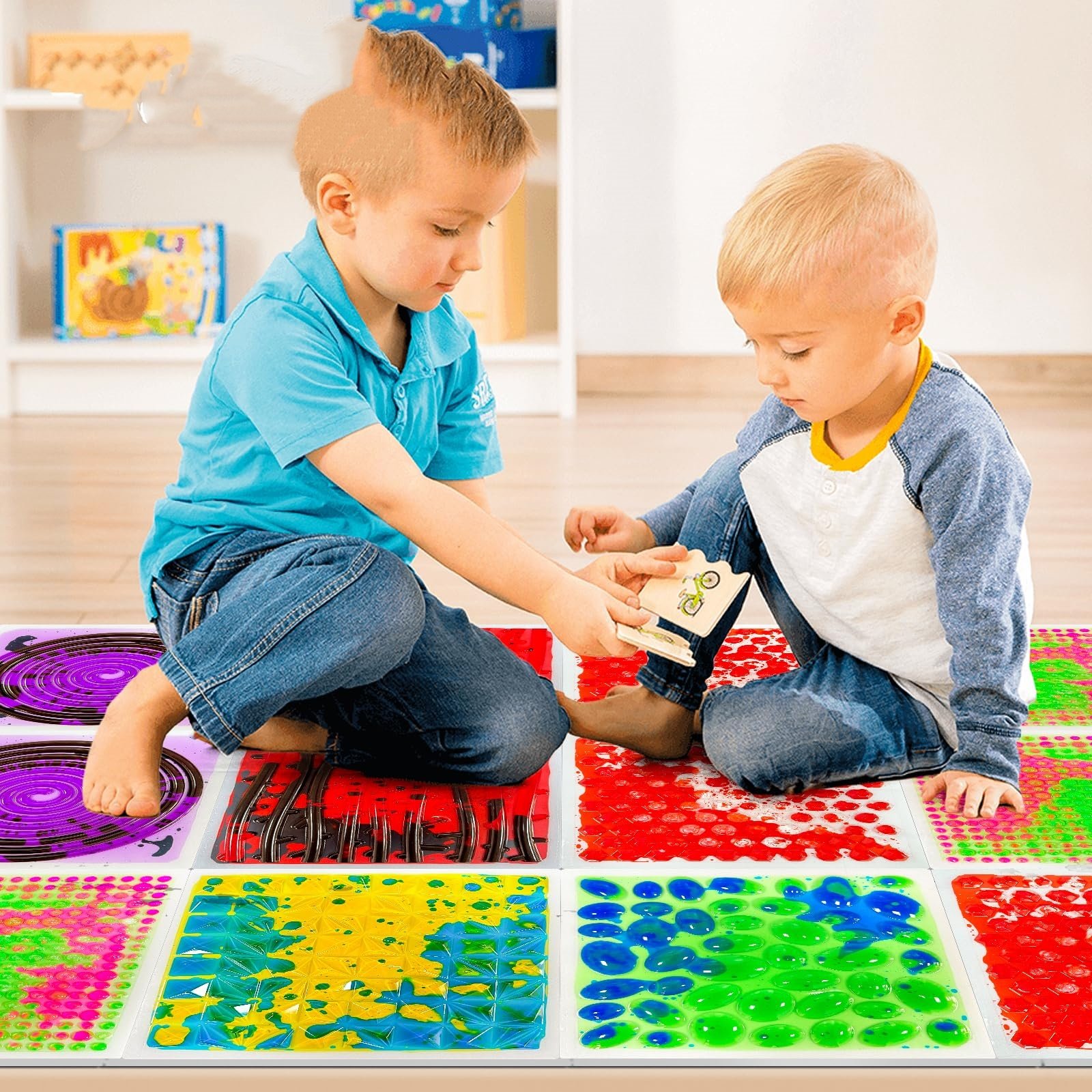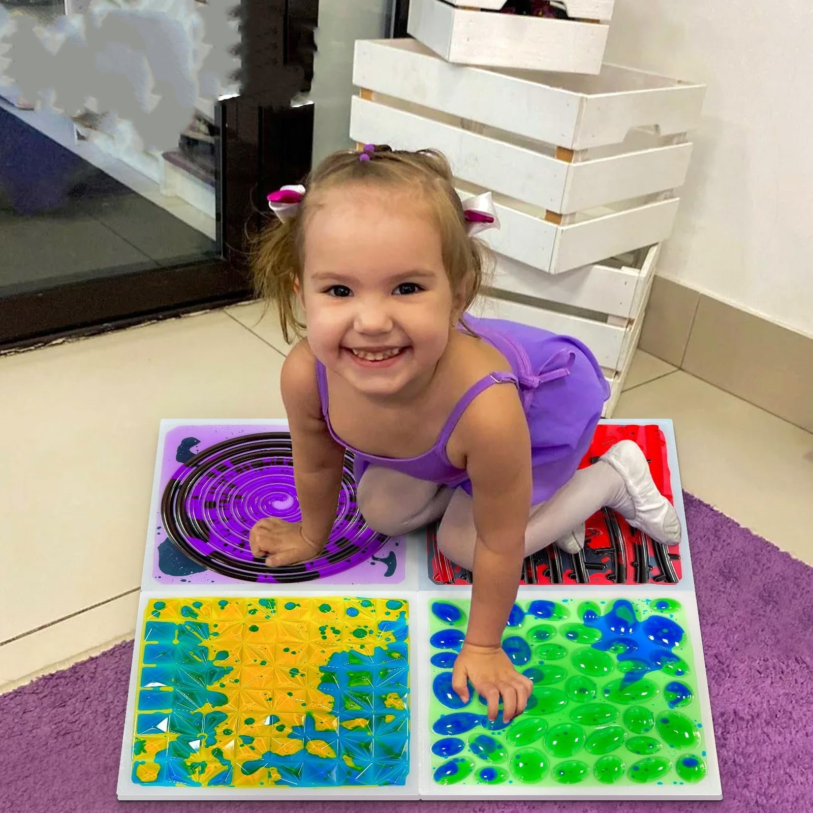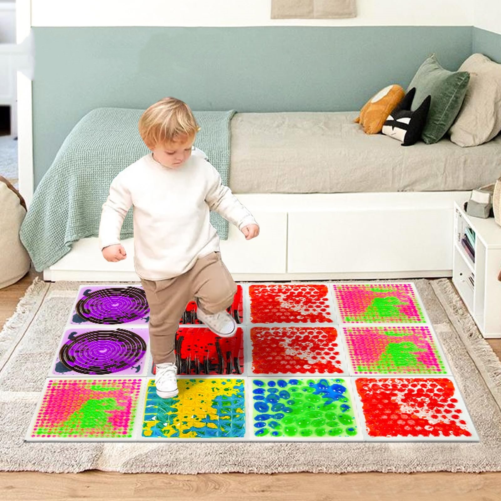 • TEXTURED TACTILE PLAY TILES – Each tile reacts to pressure with colorful liquid flow, enhanced by surface textures that provide additional tactile feedback. Designed as interactive stepping toys, these sensory tiles stimulate visual and touch senses, making them ideal for children’s sensory development activities.